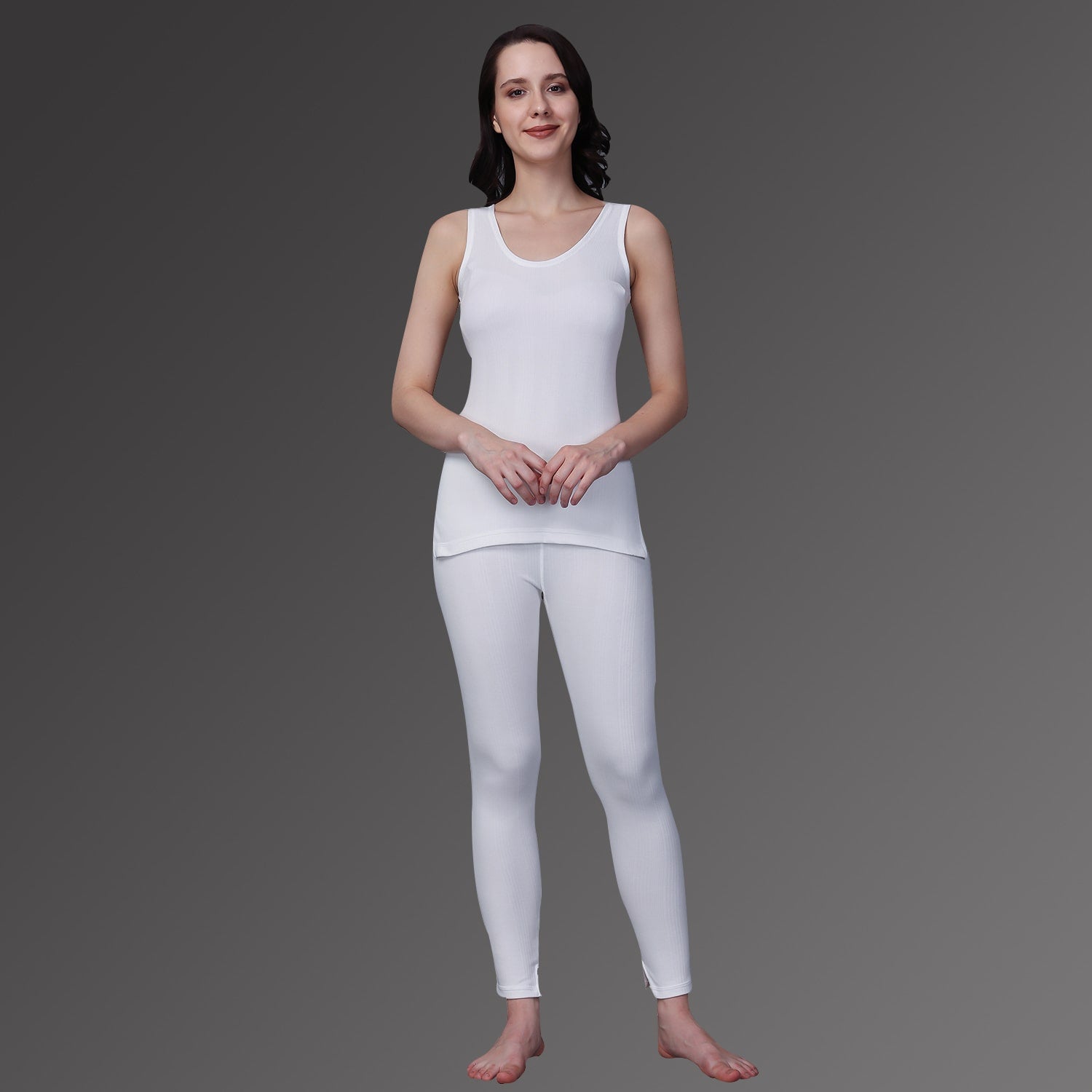 Scoop-neck camisole and snug-fit thermal pants designed as the perfect base layer under jeans, pajamas, workout gear, or everyday outfits.